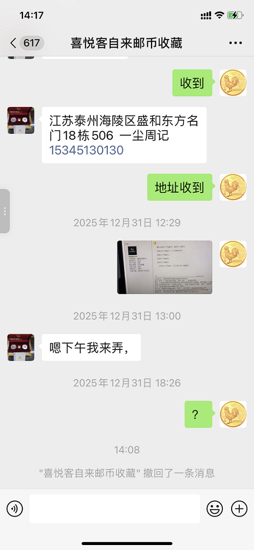 网名悦客来邮币收藏交流确认我一批福字币一直不付款,现在已过48小时了,我一般不投诉买家,但此买家比较特殊!他每次都是半夜之后确认,他第一次是12月23日0点27分确认我的福字币(当银价已高于我的售价),等到白天银价更高,我这边还是正常完成交易(每枚比银价低了近10元)。第二次他于12月31日1点34-37两次确认一批福字币,我回贴后微信问他,他说下午处理,然后没下文了,后面不打款微信也不回!请版主公正处理!谢谢!