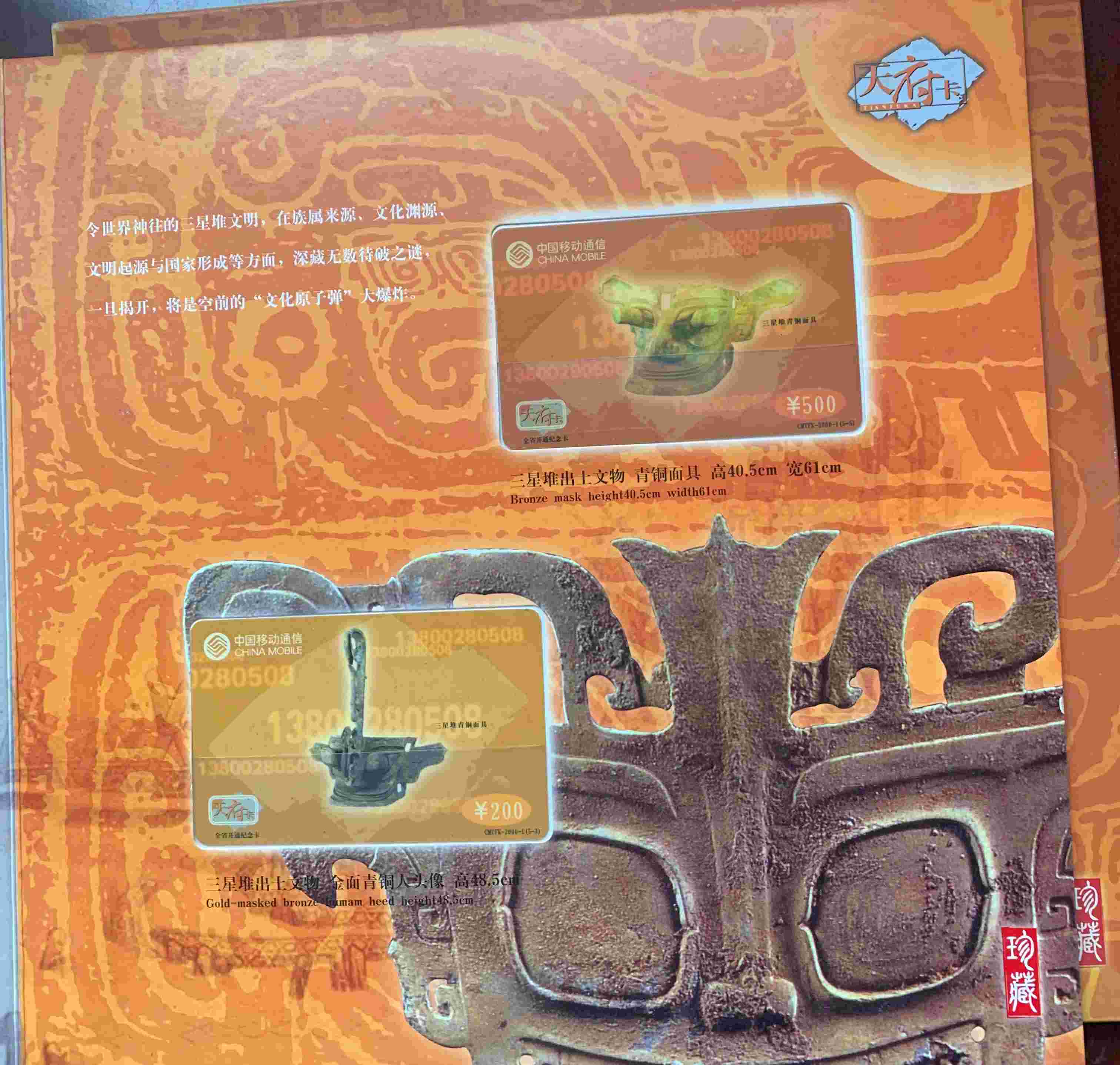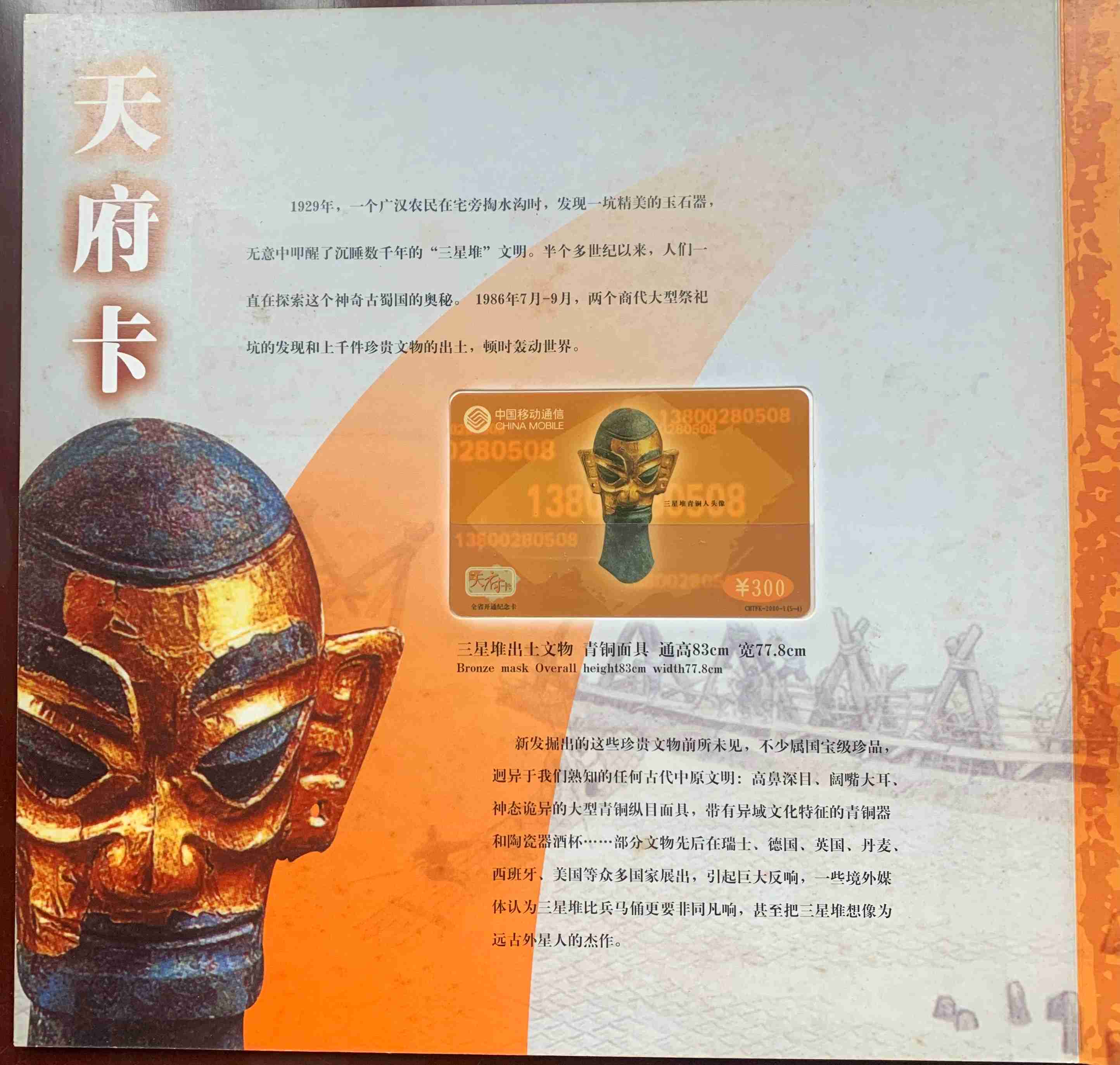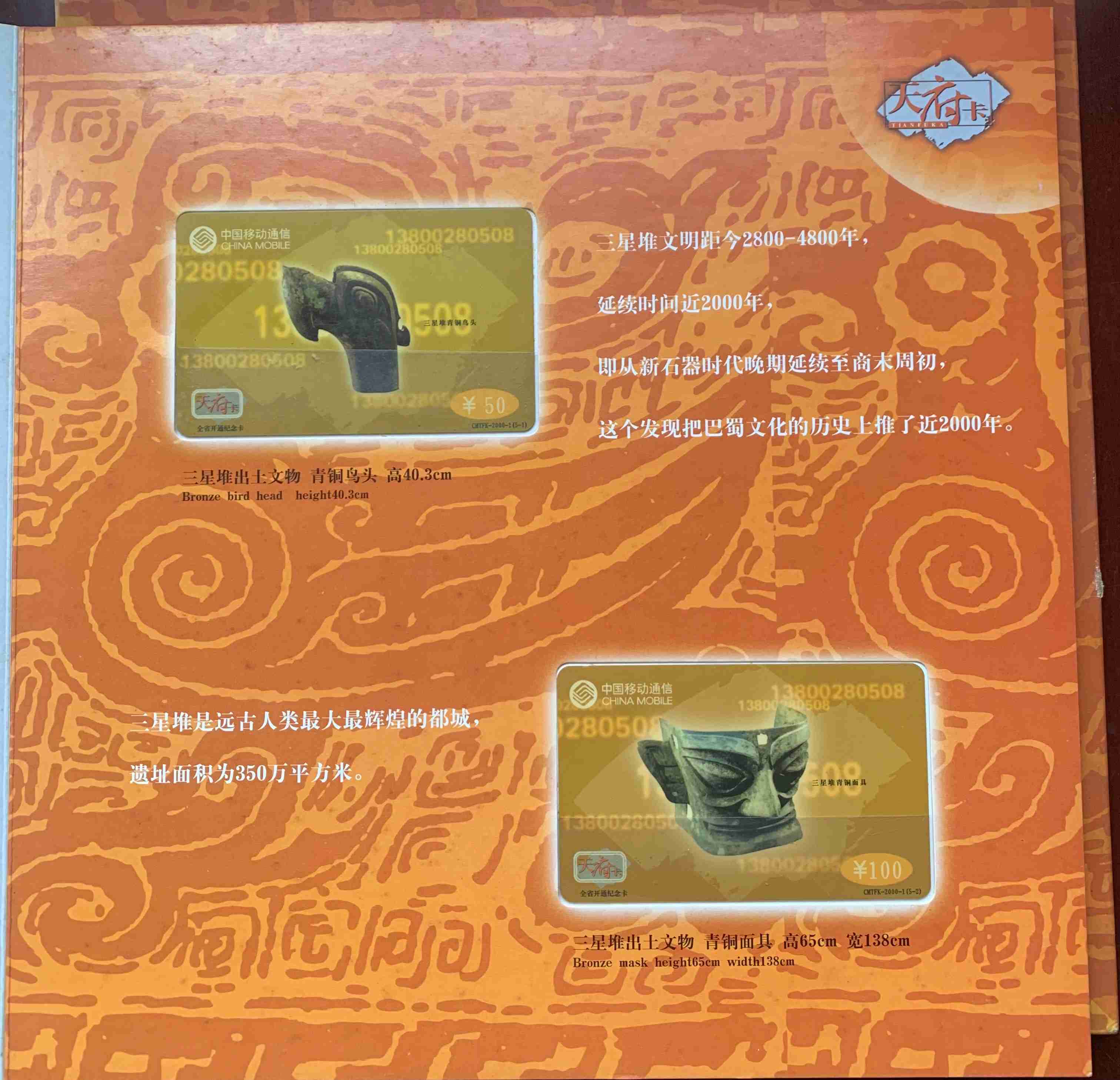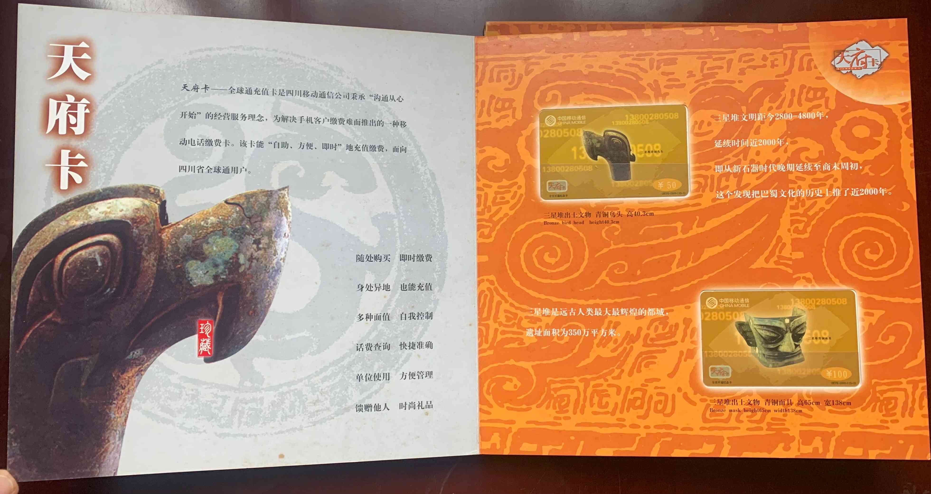 【三星堆】天府卡纪念册一册 120.00元一套5枚,面值:50元、100元、200元、300元、500元。本帖商品为已使用旧卡,发行量:10000套。本套流水号码:0007428。品如图。包经济快递。先款后货。