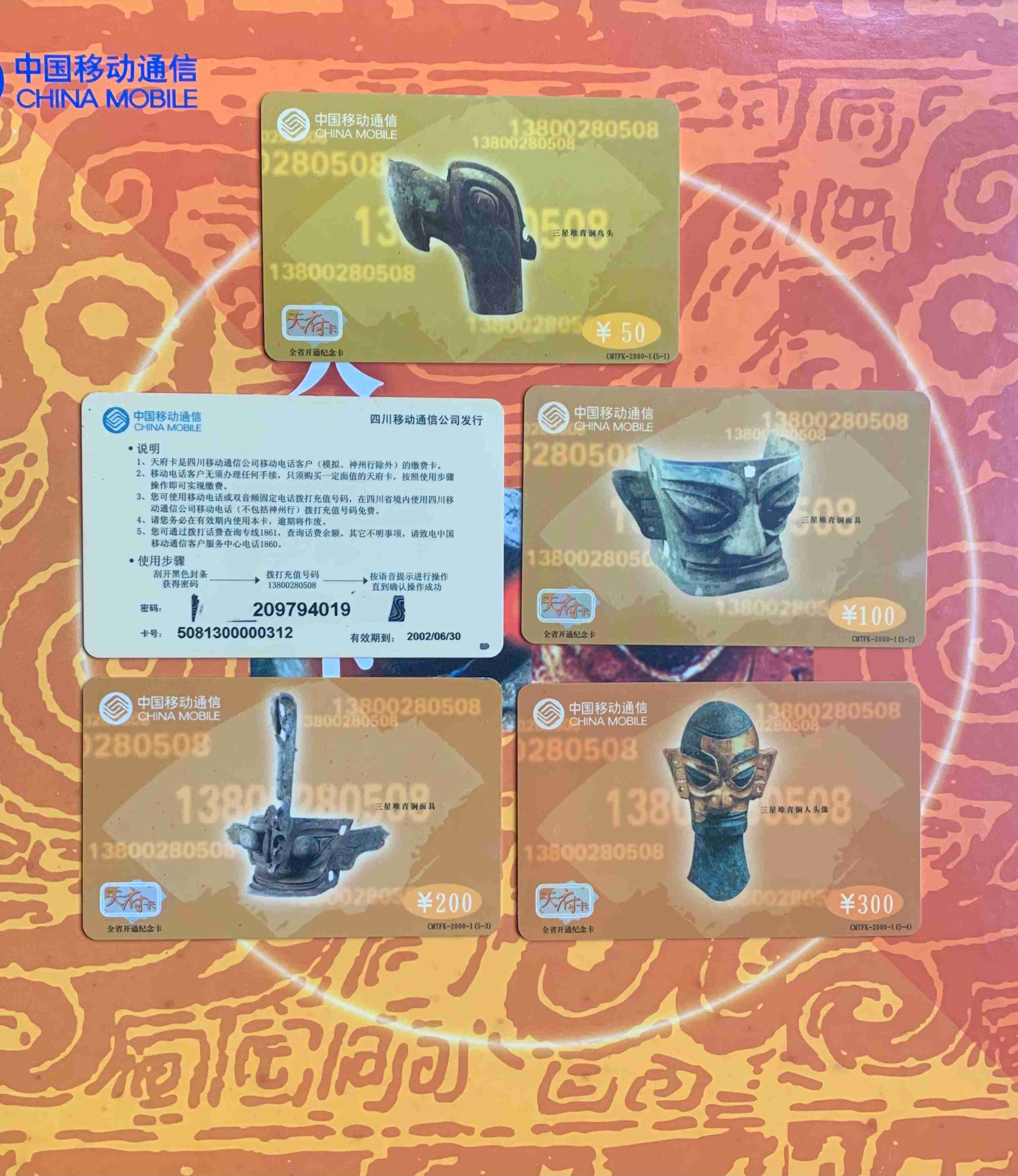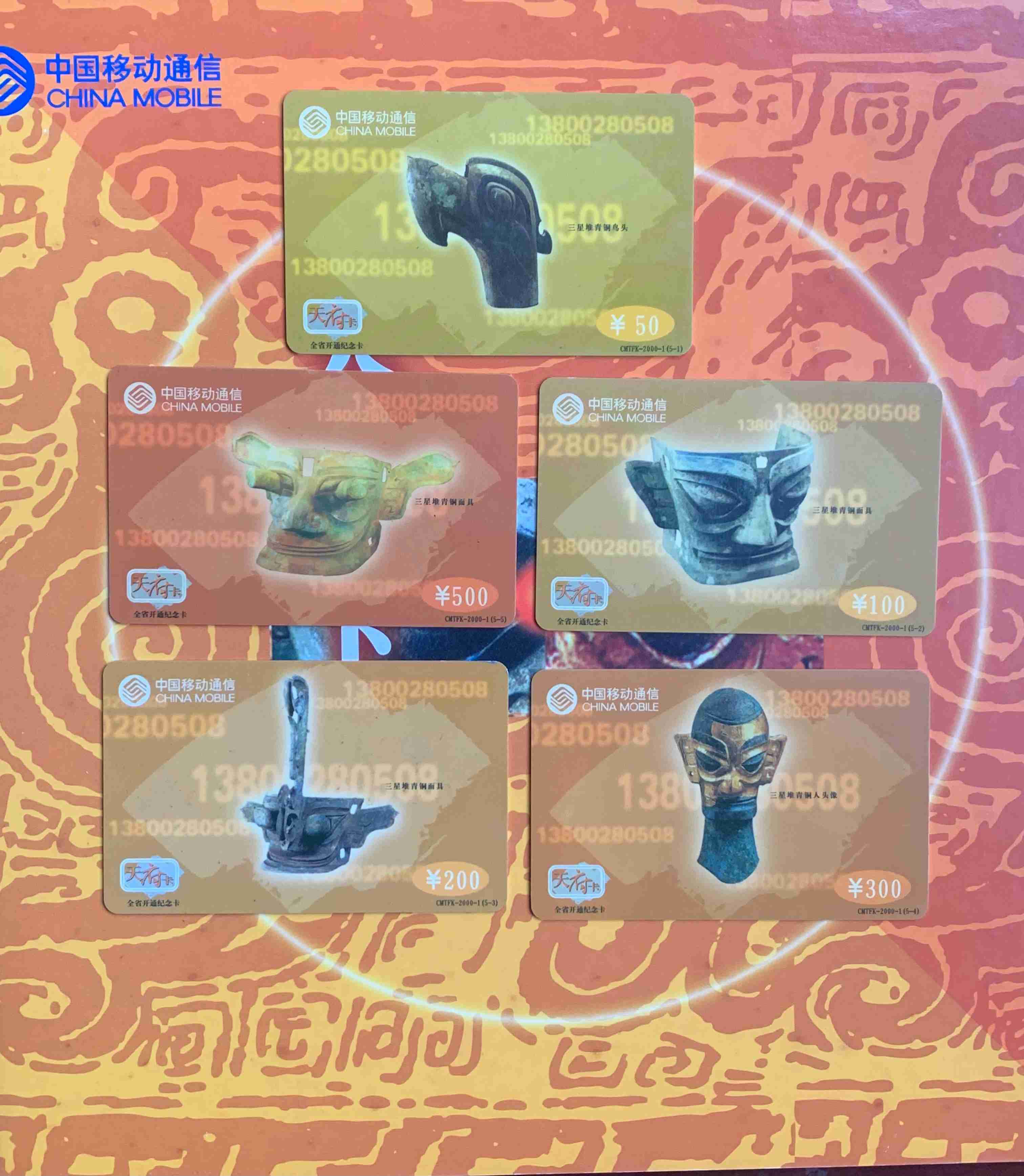 一套5枚,面值:50元、100元、200元、300元、500元。本帖商品为已使用旧卡,发行量:10000套。本套流水号码:0007428。品如图。包经济快递。先款后货。
