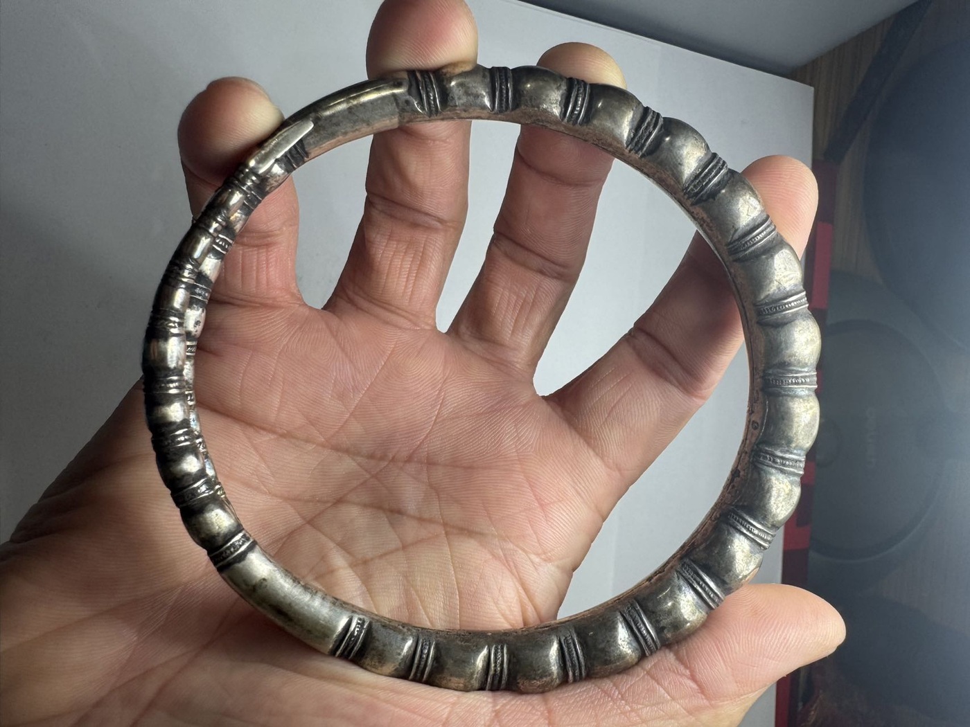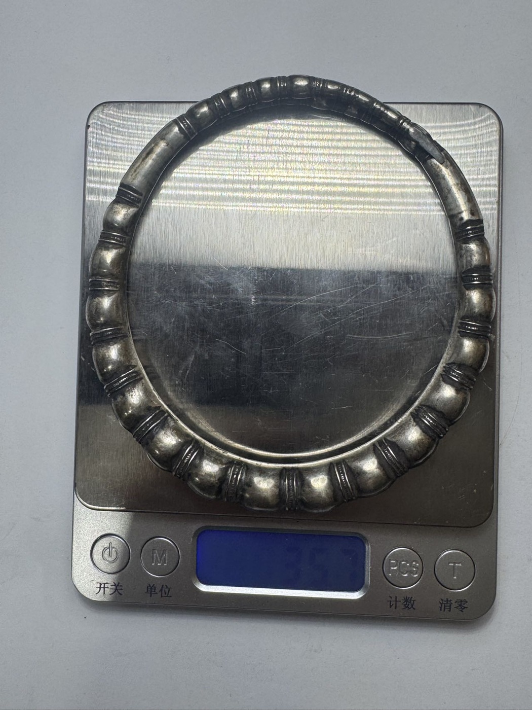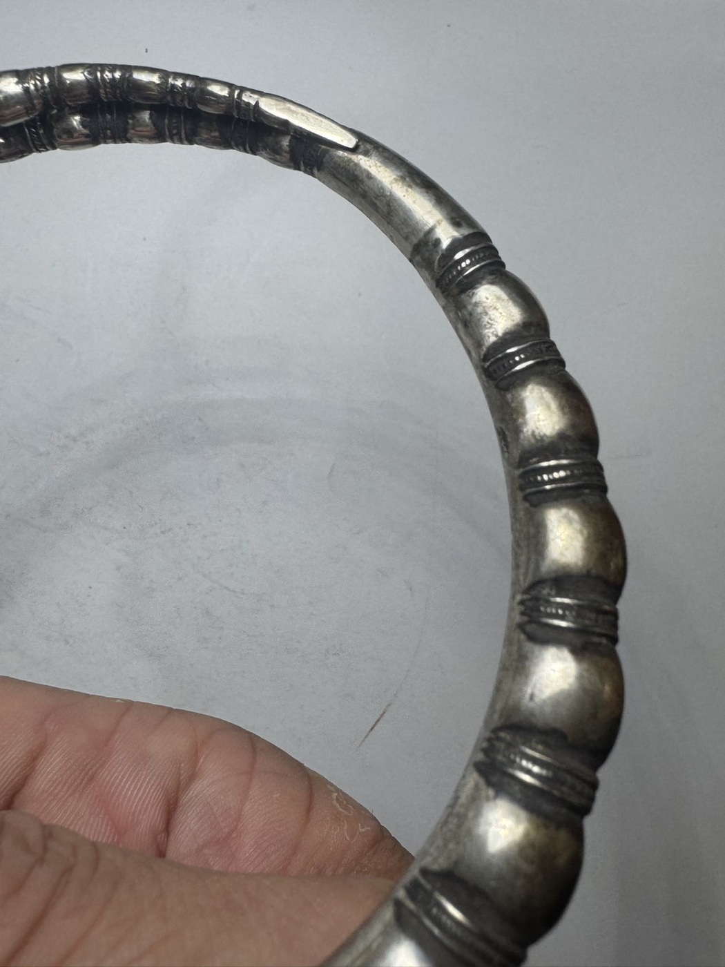 清代大尺寸老银镯子,佛肚竹节造型,有款如图3,外径10.5厘米左右,内径9厘米左右,空心的,老工非纯银,当年的工艺都是如此。
