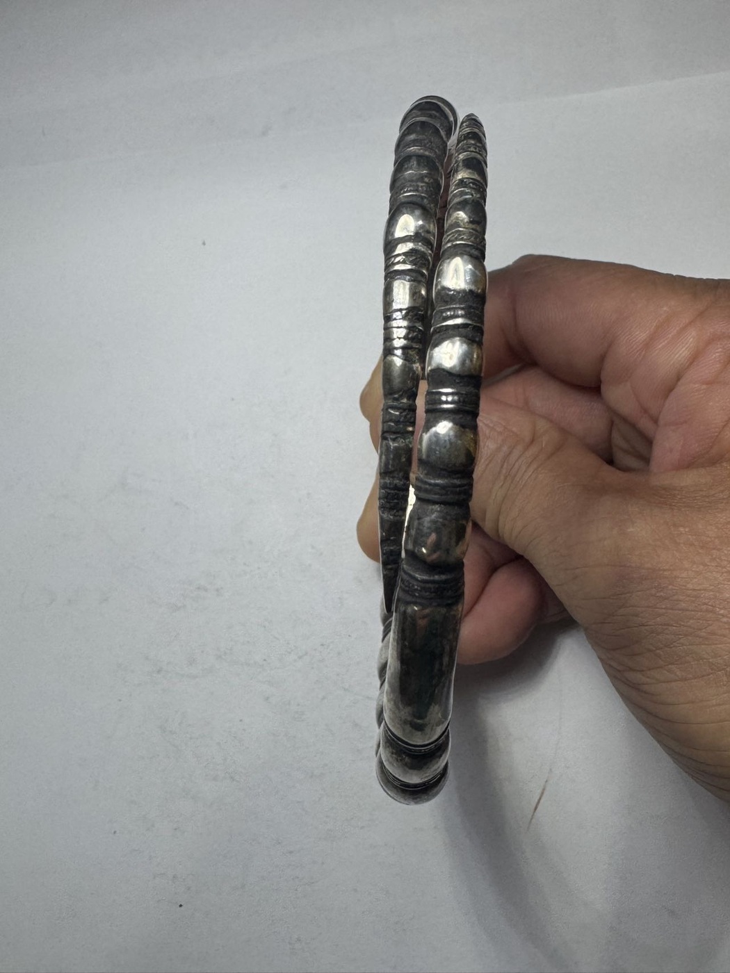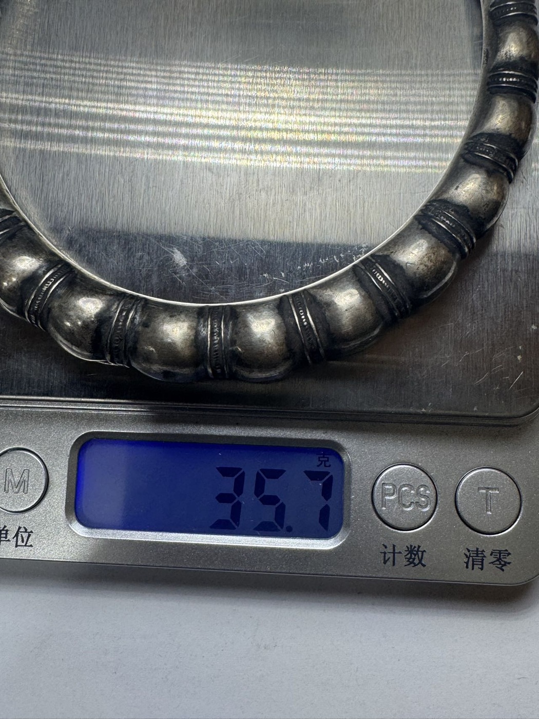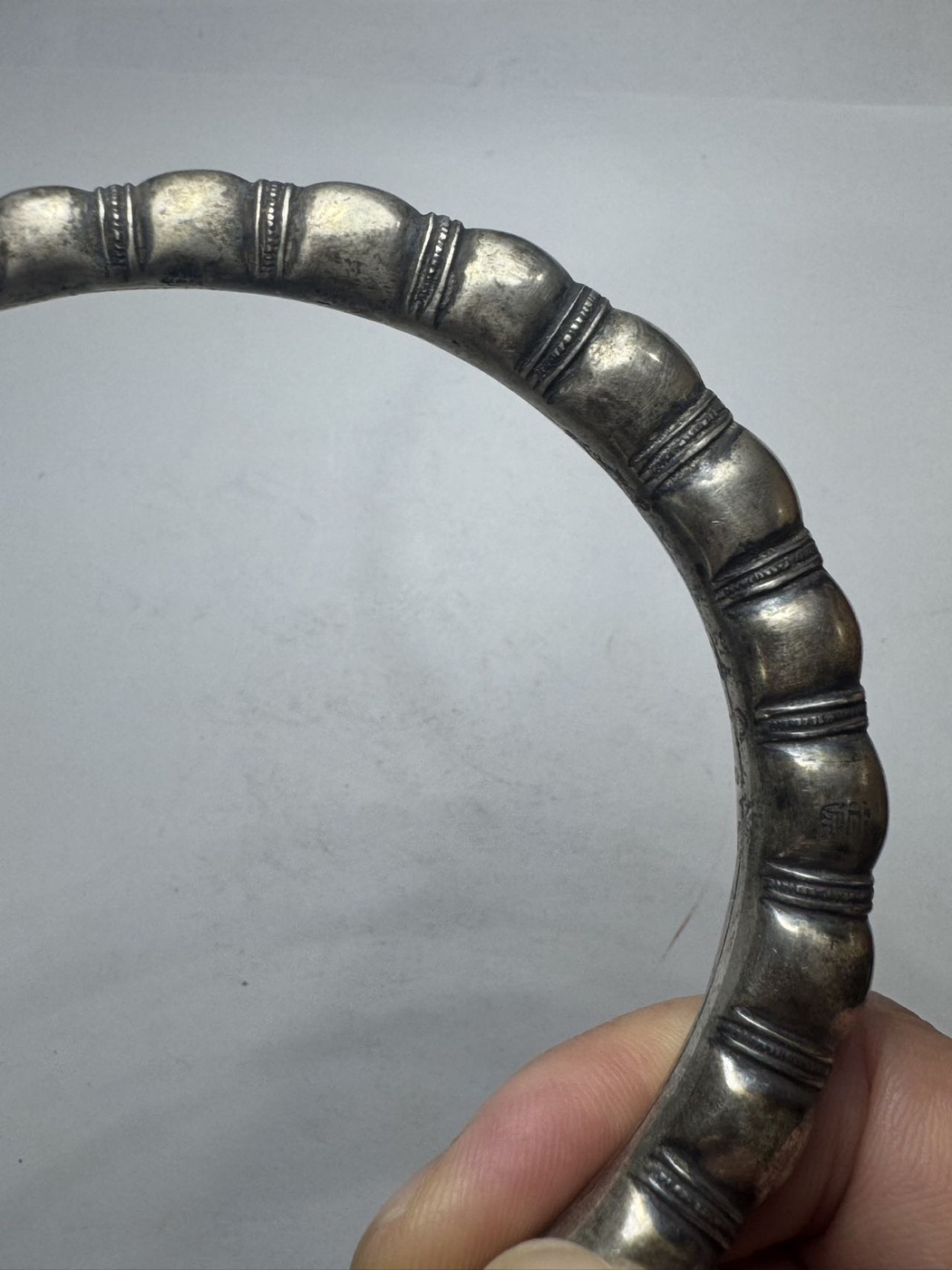以下是引用邮子天涯在2026/1/9 10:49:00的发言:清代大尺寸老银镯子,佛肚竹节造型,有款如图3,外径10.5厘米左右,内径9厘米左右,空心的,老工非纯银,当年的工艺都是如此。