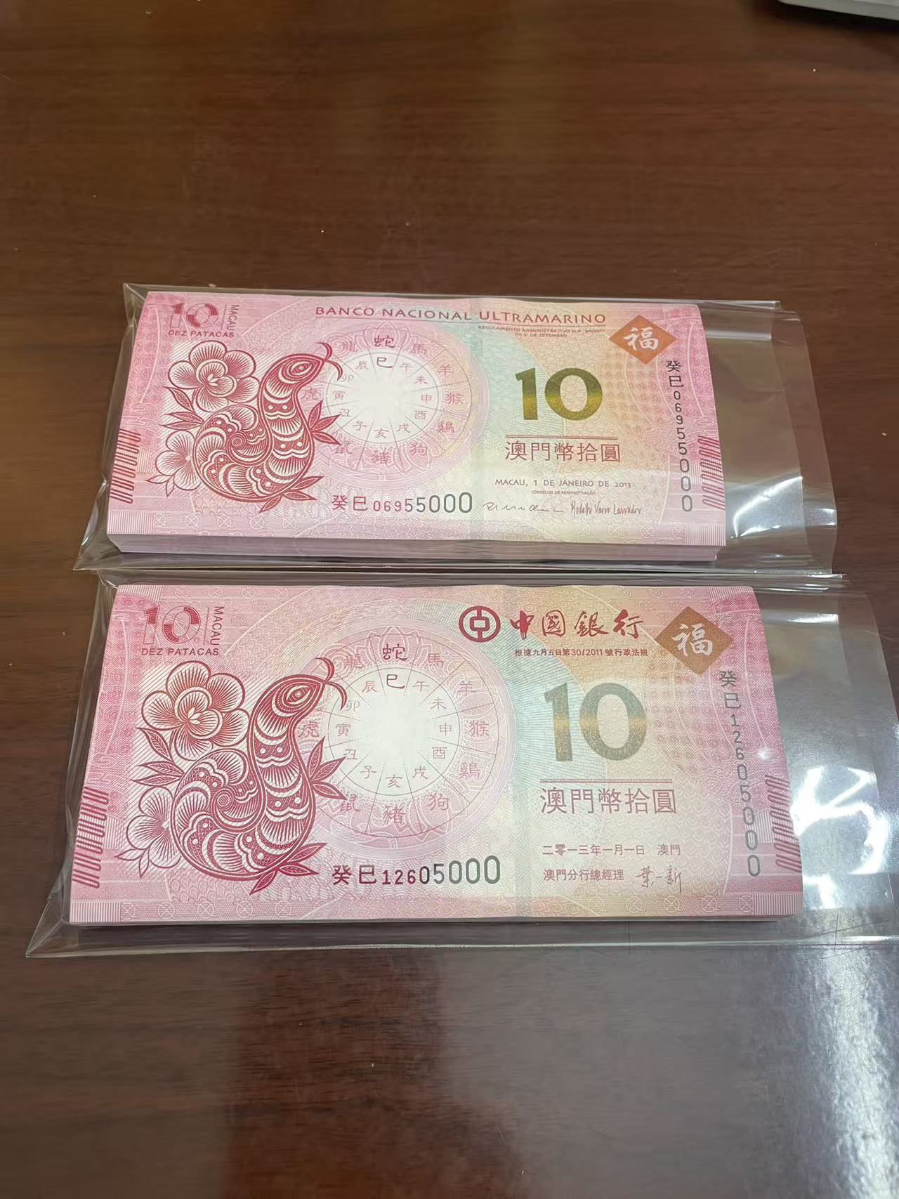 便宜出澳门生肖钞蛇钞百联尾4同号一对刀,一刀0569金马王,一刀无347,带豹子号000,可以配套大陆生肖蛇钞做礼品,仅售1980元,不议价,包顺丰!直接确认有效!