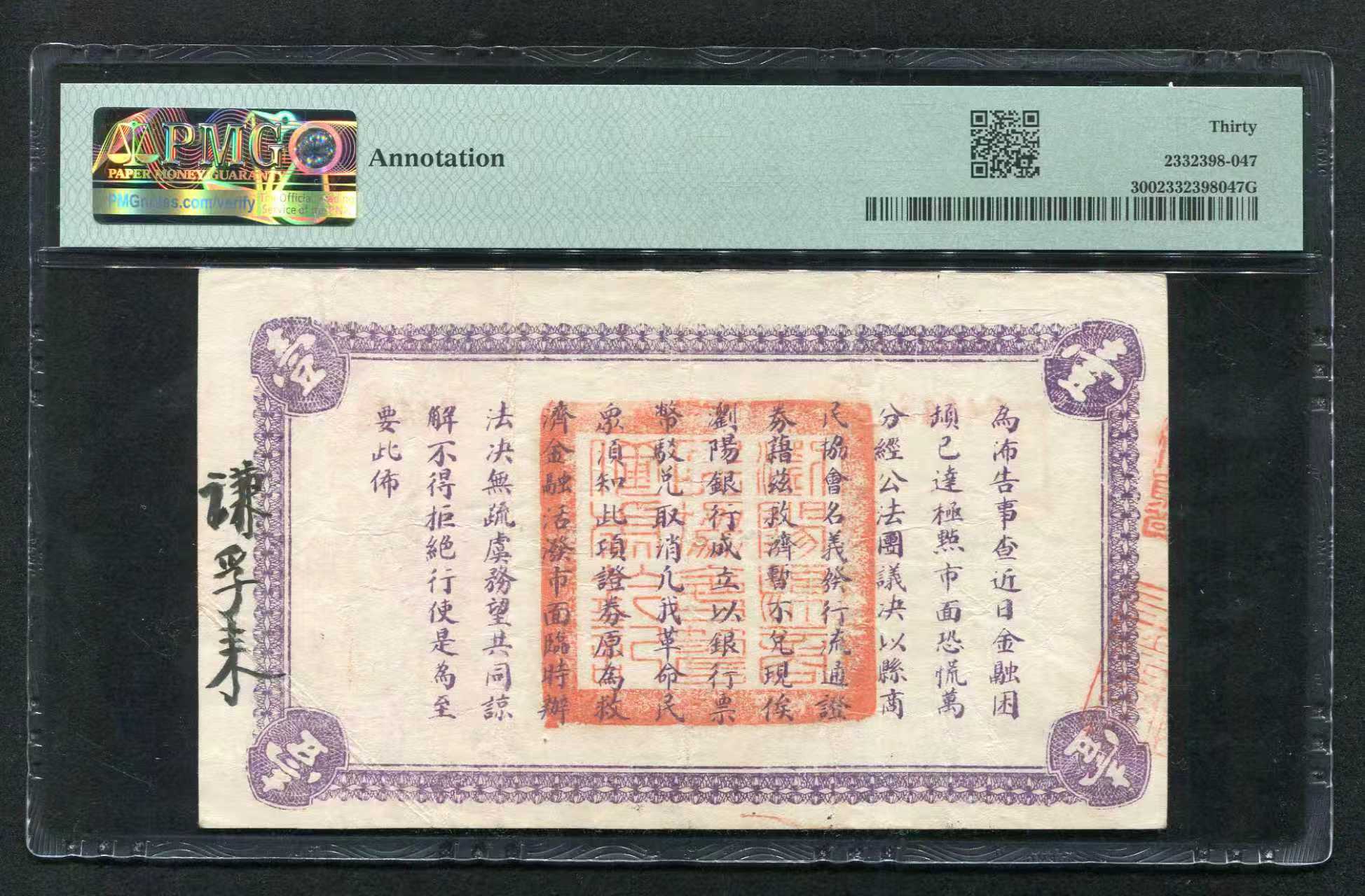 售民国十六年 浏阳县商民協会流通券 壹圆 PMG30